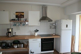 - Küche mit Spülmaschine, Ceranfeld, Backofen, Microwelle, großer Kühlschrank